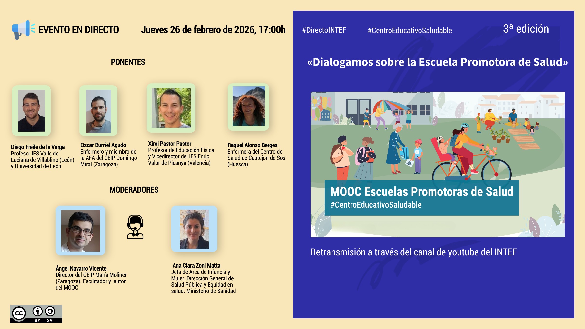 Además, para reflexionar y profundizar en lo que significa ser una Escuela Promotora de Salud, realizaremos un evento formativo en directo, en el que conoceremos de más cerca la experiencia de 4 centros educativos promotores de salud. El evento en directo tendrá lugar a las 17:00 hora española, el jueves 26 de febrero y podrás visualizarlo en la pestaña de evento en directo de la plataforma. Podéis acceder al evento en el siguiente enlace.